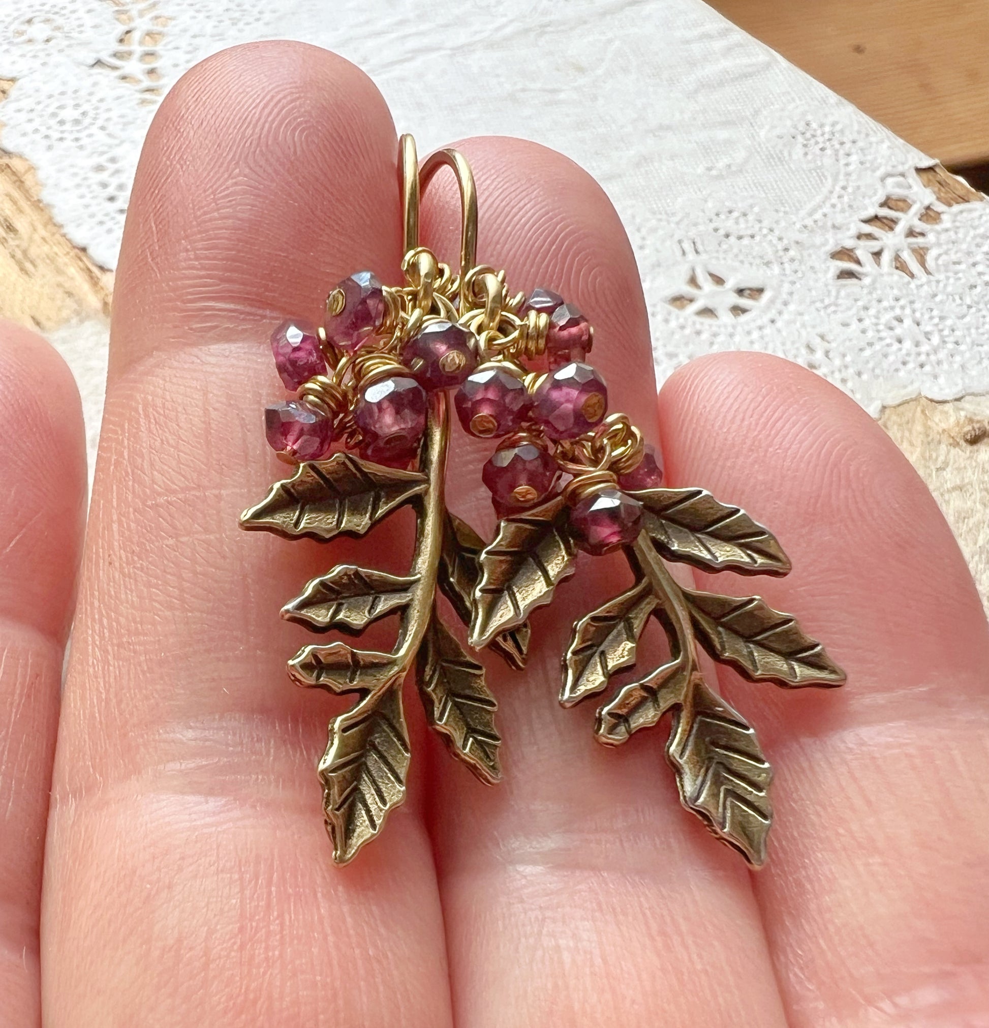 Garnets and brass leaf earrings