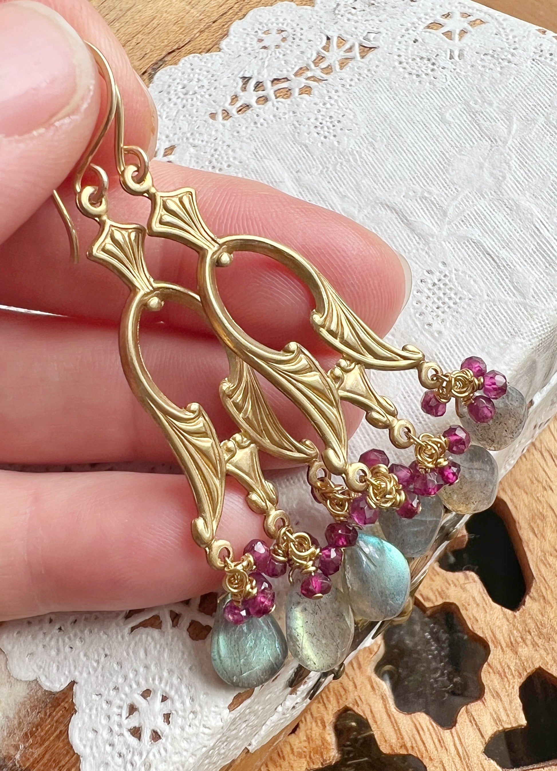 labradorite and garnet chandelier earrings