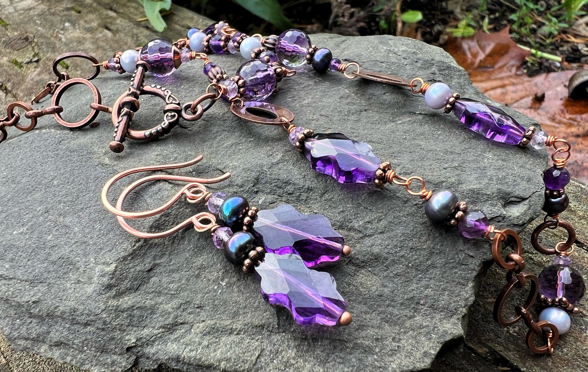 Amethyst and copper necklace and earring set